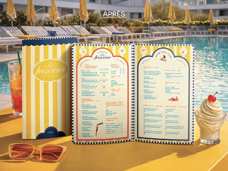 • La création de menus et cartes sur mesure pour le bar et la piscine, avec illustrations personnalisées